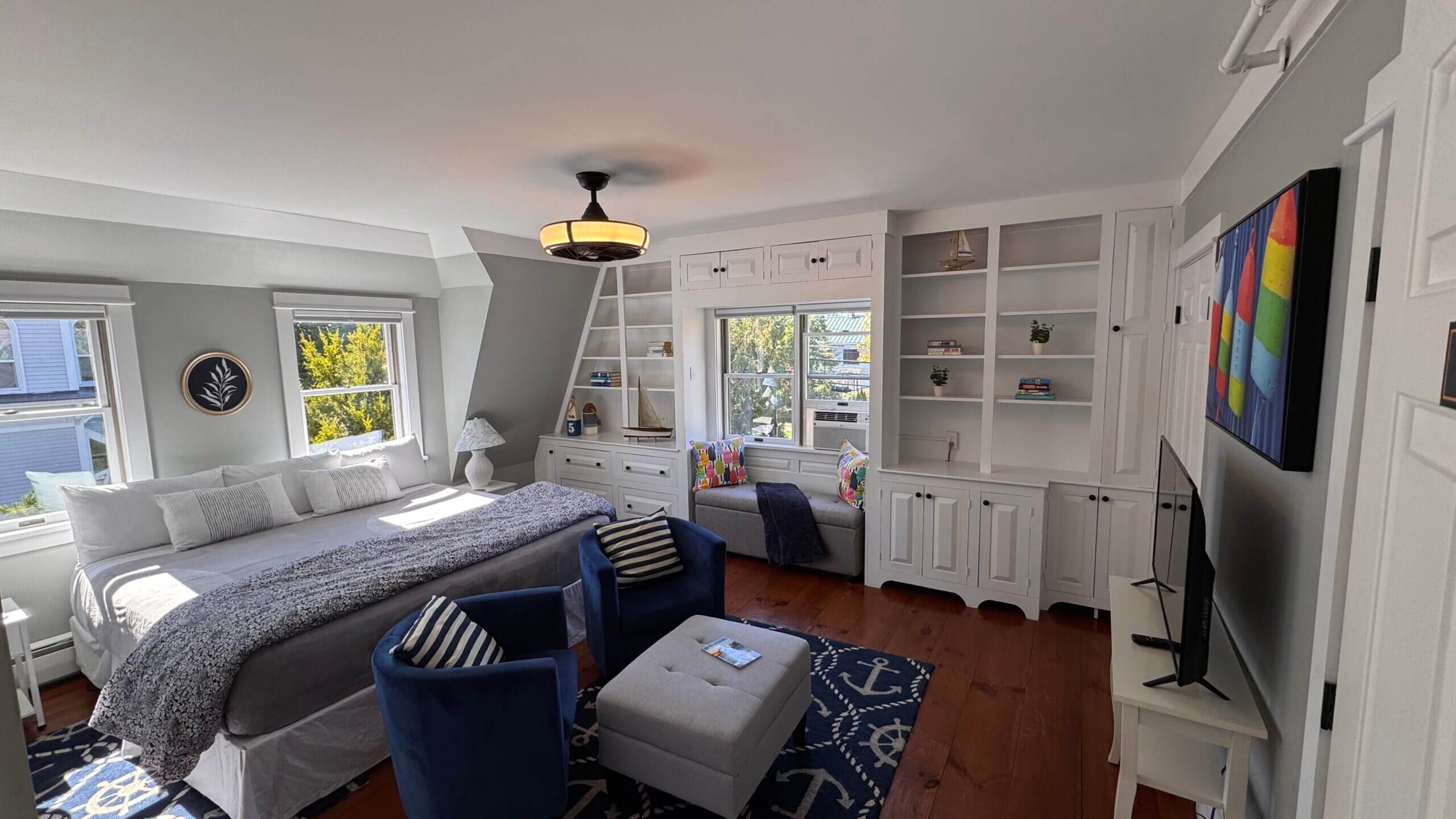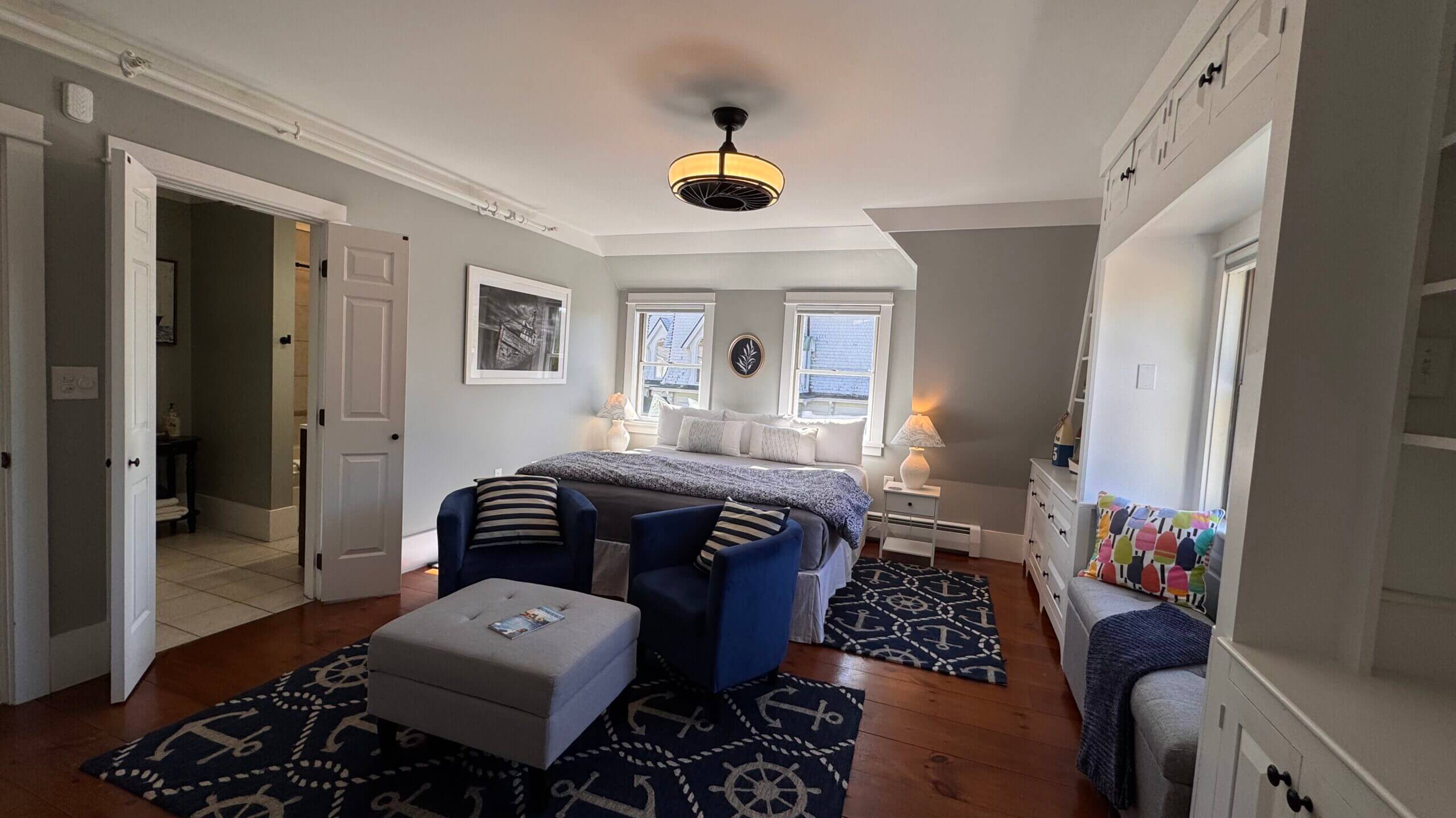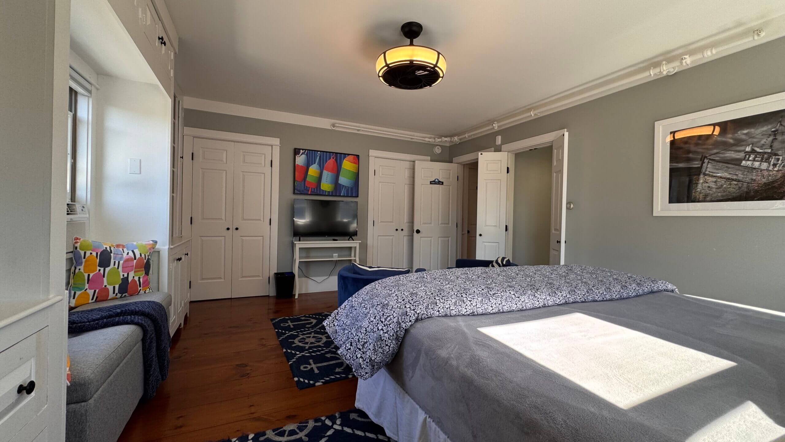 The USS Iron Age at the White Sails Inn is a spacious bed and breakfast in Kennebunk, Maine, perfect for a couple’s getaway. This beautiful and spacious room can accommodate up to two guests with a King-size bed. The ensuite bathroom has dual vanities and a shower/tub combo. Spend the weekend relaxing indoors enjoying the comfortable seating area for two and cable television, or adventure outside to see what the Kennebunks has to offer. Your charming room is equipped with a smart TV, mini refrigerator, toiletries, and a hair dryer. Iron board and steamer are available on request.